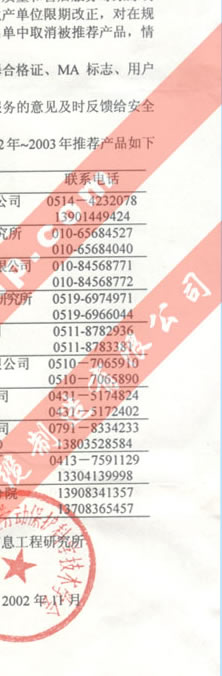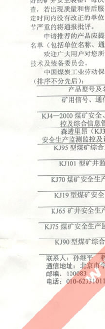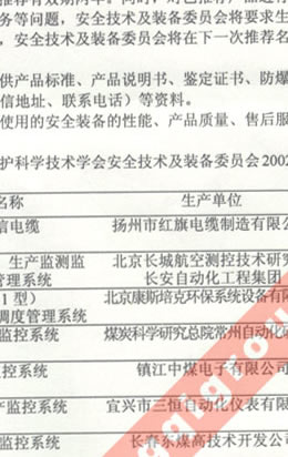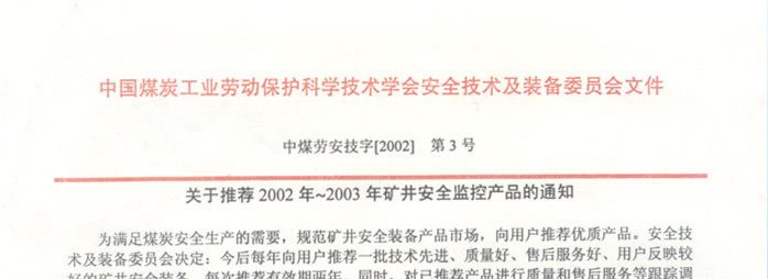 中國煤炭工業(yè)勞動保護(hù)科學(xué)技術(shù)學(xué)會安全技術(shù)及裝備委員會推薦2002-2003年礦井安全監(jiān)控產(chǎn)品的通知(我公司生產(chǎn)的礦用信號、通信電纜排名第一位)